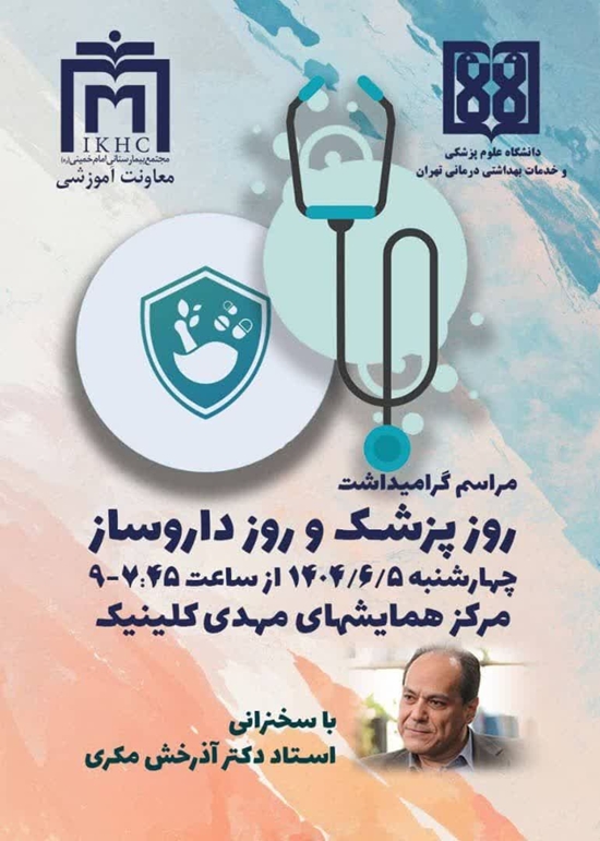 مراسم گرامیداشت روز پزشک و داروساز مراسم گرامیداشت روز پزشک و داروساز روز چهارشنبه 5 شهریورماه 1404 ساعت 7:45 الی 9 در سالن همایش مهدی کلینیک برگزار میشود. کد خبر : 303559 کپی کلمات کلیدی مجتمع_بیمارستانی_امام_خمینی