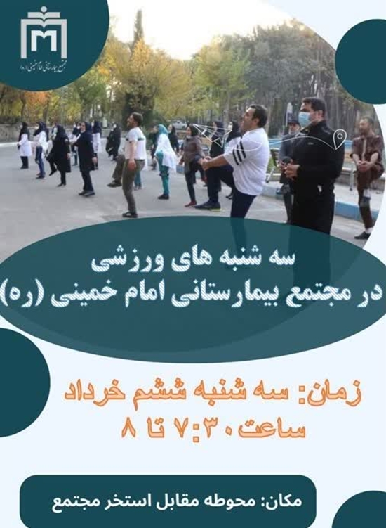 به گزارش روابط عمومی مجتمع بیمارستانی امام خمینی(ره) دانشگاه علوم پزشکی تهران، برنامه ورزشی در این مرکز سه شنبه 6 خرداد در محوطه مقابل استخر برگزار میشود.
